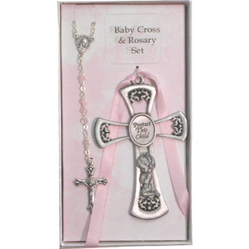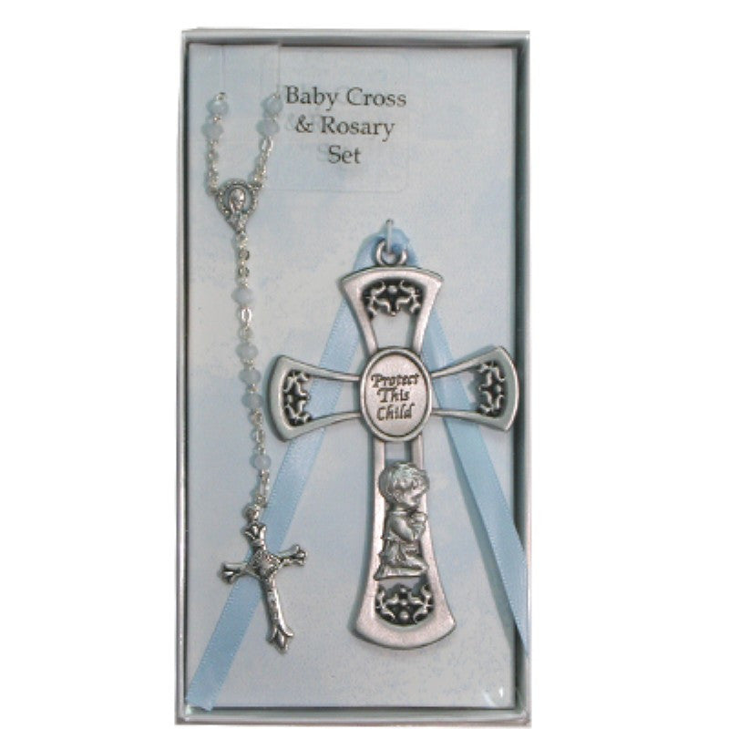 4" Pewter Cross with boy/ girl kneeling and praying. "Protect this Child" engraved in middle of the cross. Comes with a metal rosary with pearl beads.
