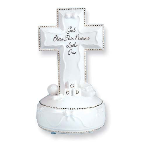 This is a Musical 7"God Bless Porcelain Cross. Its dimensions are 7"H x 4.5"L; Touched with silver trim atop base relief baby images, this adorable delight features a sweet blessing. That's not all. It's a music box that plays "Jesus Loves Me." Little things mean a lot - especially when given to little ones who mean even more!