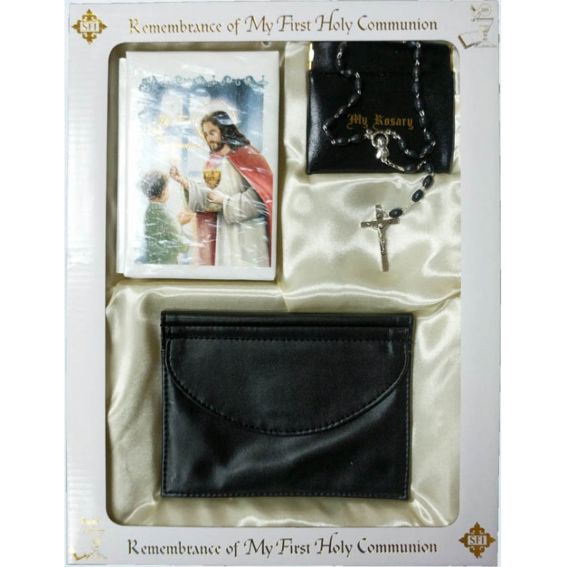 Boy Set features black oval rosary beads on silver chain with black rosary case. Pearl Mass book with Jesus and First Communion boy on cover. Comes with black leather cover to hold Mass book.