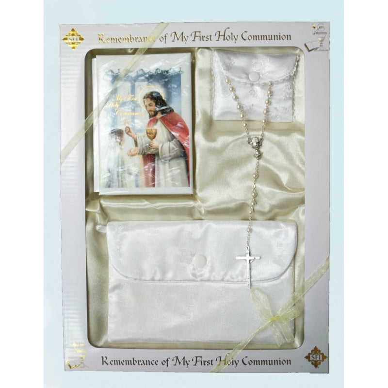 Girl Set features white pearl gold chain rosary with white rosary case. Pearl Mass book with Jesus and First Communion girl on cover. Comes with white purse.