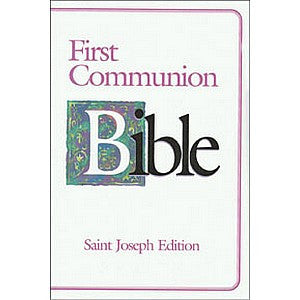 A beautiful vinyl over paper flexible cover gift edition specially designed for a girl's First Holy Communion. Pages are edged in pink. This Bible contains a full color 8 page First Communion Certificate Presentation Page, a Prayer Section containing the Lord s Prayer, a listing of the Sacraments the Rosary, and the Nicene Creed Rosary includes the luminous mysteries, Christ s parables, and miracles list of the popes.