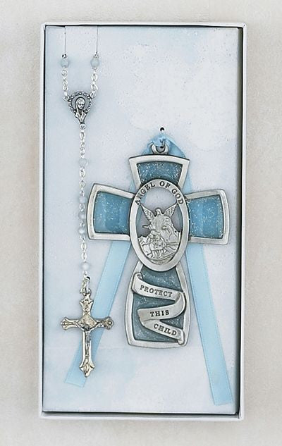 Glittered blue/ pink guardian angel cross with pewter. Engraved with "ANGEL OF GOD" and "PROTECT THIS CHILD"; Comes with blue/ pink pearl rosary.