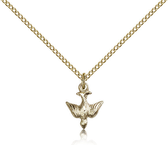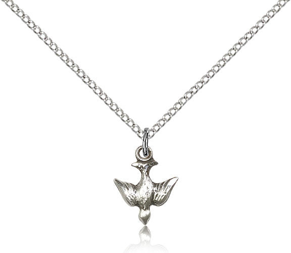 Holy Spirit medal 1/2 x 3/8" on 18" chain. Available in sterling silver with silver plated chain & 14kt gold filled with gold plated chain.