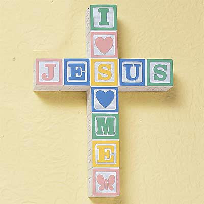 "I Love Jesus" ABC Block Wall Cross--Pastel. Resin with raised block motif. Available in pastel or primary colors. Hand painted. Ready to hang. Gift boxed. 6 1/4" x 8 3/4".