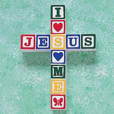 "I Love Jesus" ABC Block Wall Cross--Primary. Resin with raised block motif. Available in pastel or primary colors. Hand painted. Ready to hang. Gift boxed. 6 1/4" x 8 3/4".
