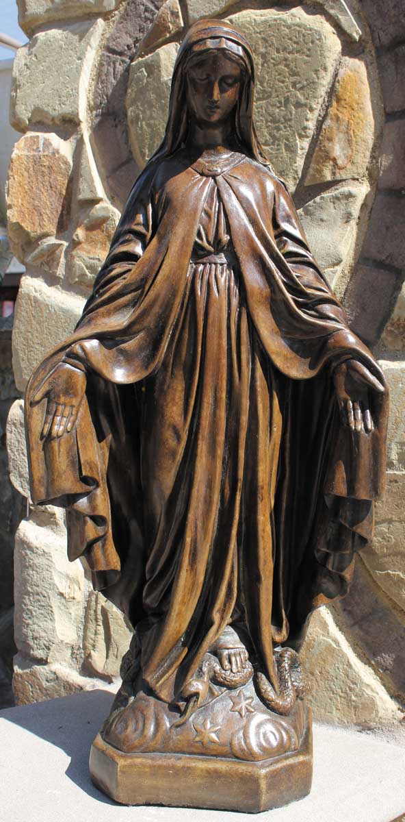 Large Our Lady of Grace concrete statue. Shown in mocha gloss. Available in white.
