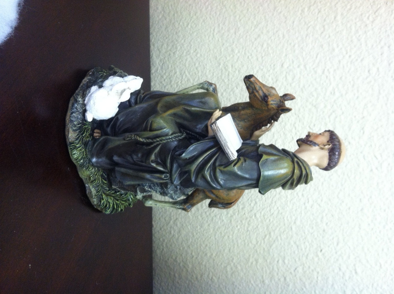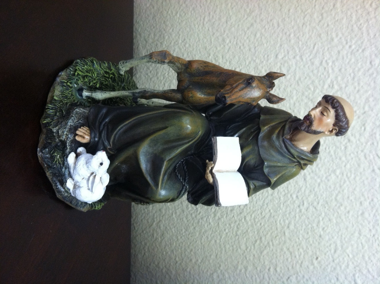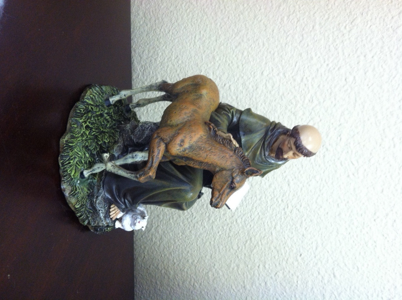St. Francis Statue with St. Francis sitting with open book, deer next to him, and white bunny sitting at this feet. Beautifully hand painted with exquisite details.